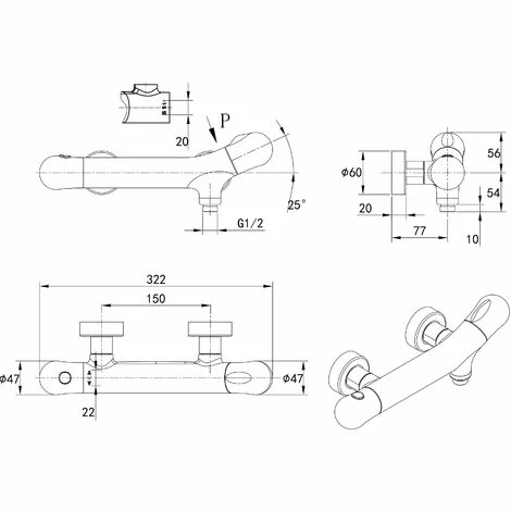 - Montage mural apparent, entraxe 150 mm.Sortie douche M15x21 (1/2).